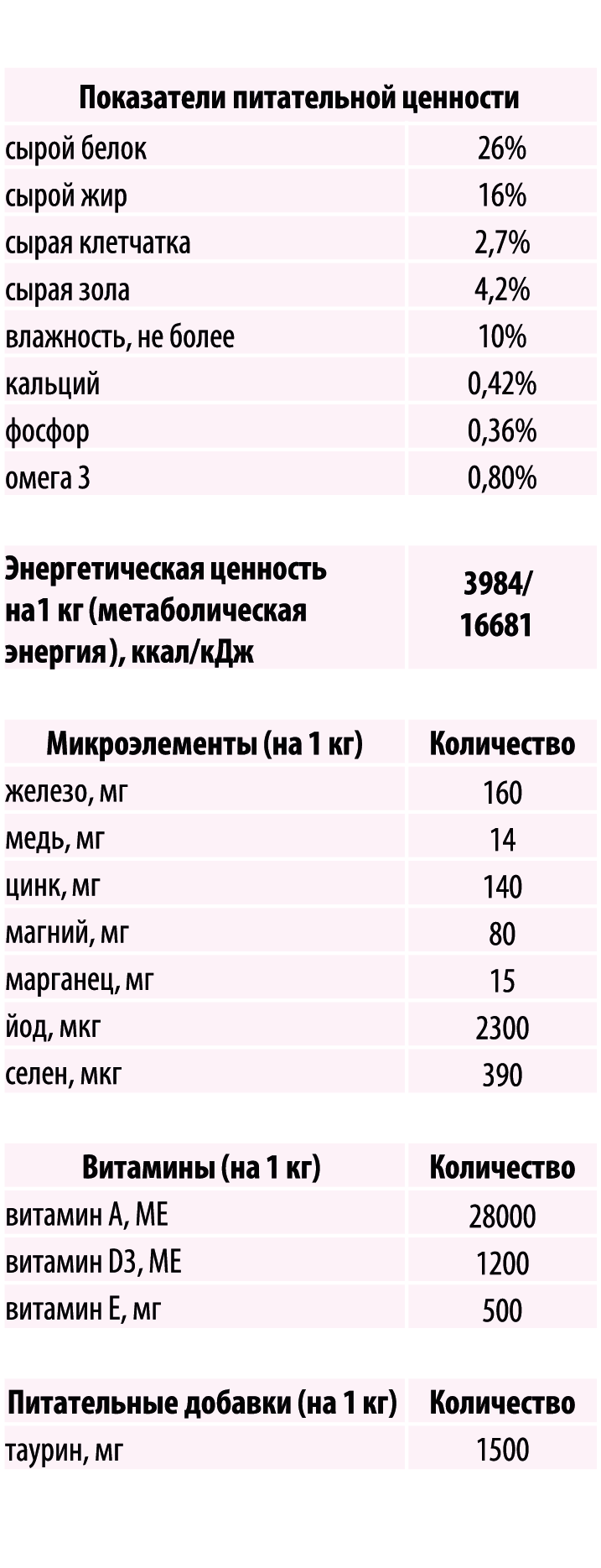Состав: пшеница, рис, сорго, жир индейки (сохранен смешанными токоферолами и экстрактом розмарина), глютен кукурузный, глютен пшеничный, дегидрированное мясо индейки, изолят растительных белков, нерастворимые растительные волокна, гидролизованные мясные белки, масло лососевых рыб (EPA - 13,1% , DHA - 7,64%), оболочка семян подорожника (источник пребиотика псиллум), инулин из топинамбура (источник пребиотиков FOS), минеральные вещества, витамины.