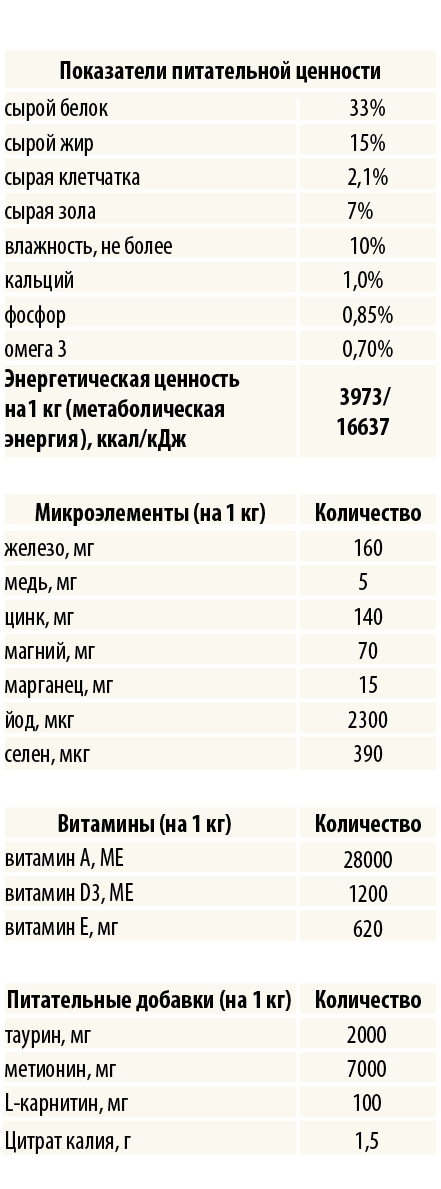 Состав: дегидратированные куриные белки, пшеница, сорго, жир индейки (сохранен смешанными токоферолами и экстрактом розмарина), горох, изолят растительных белков, гидролизованный рыбный белок, картофель, нерастворимые растительные волокна, комплекс растительных масел, масло лососевых рыб (EPA - 13,1% , DHA - 7,64%), гидролизованные мясные белки, автолизат пивных дрожжей (натуральный источник МОS), цитрат калия, DL-метионин, инулин из топинамбура, таурин, L-карнитин, витамины и минералы